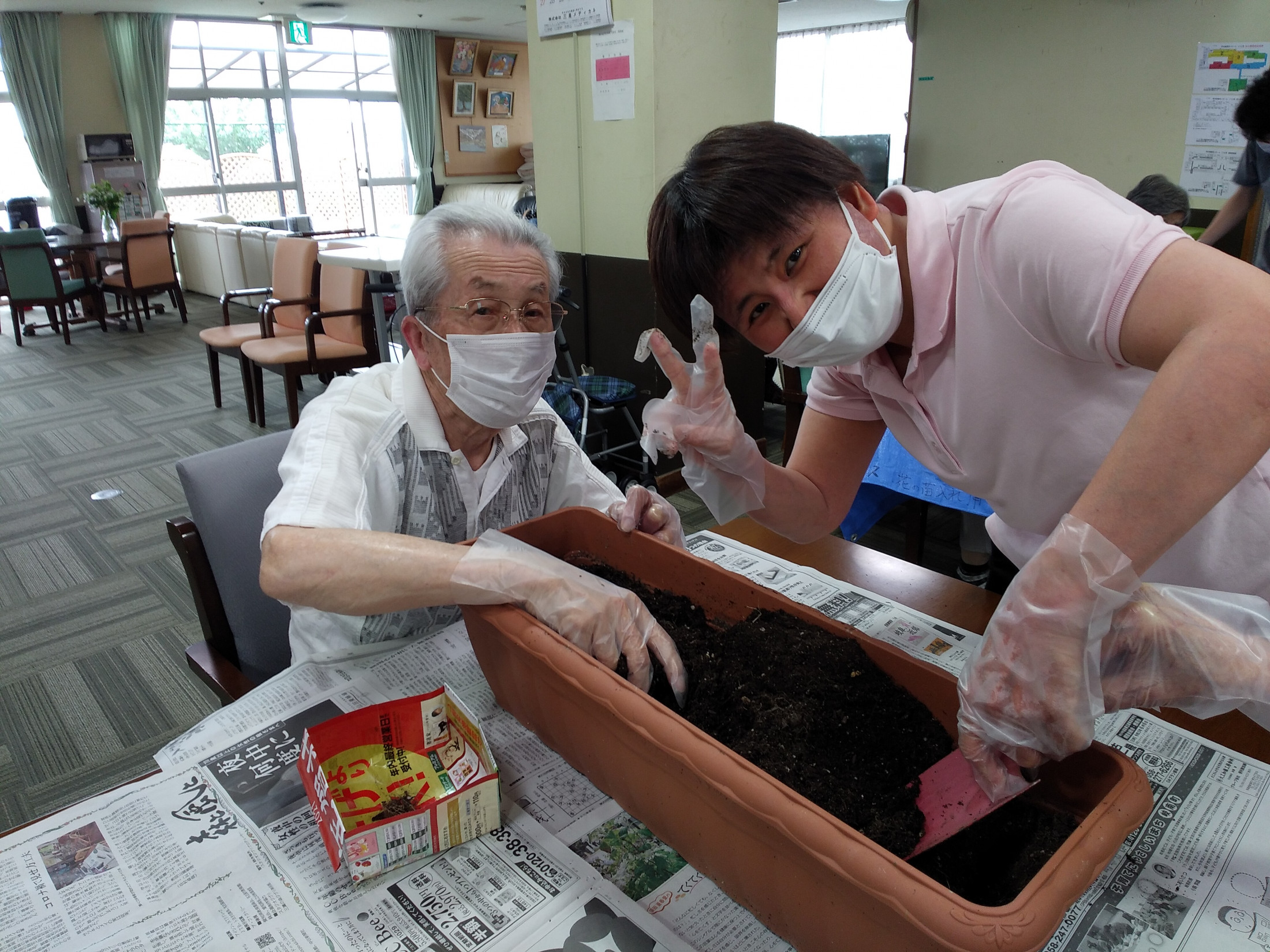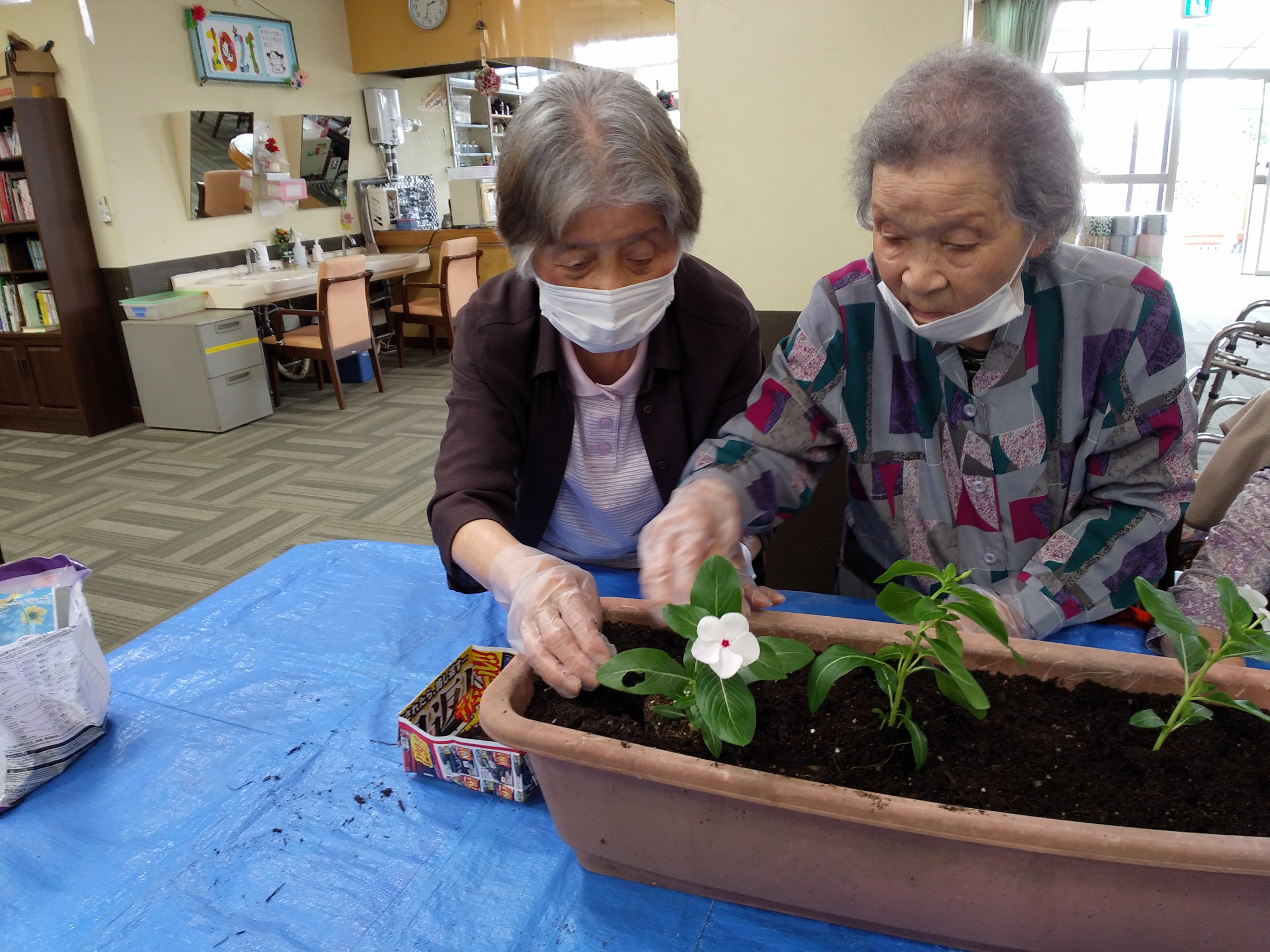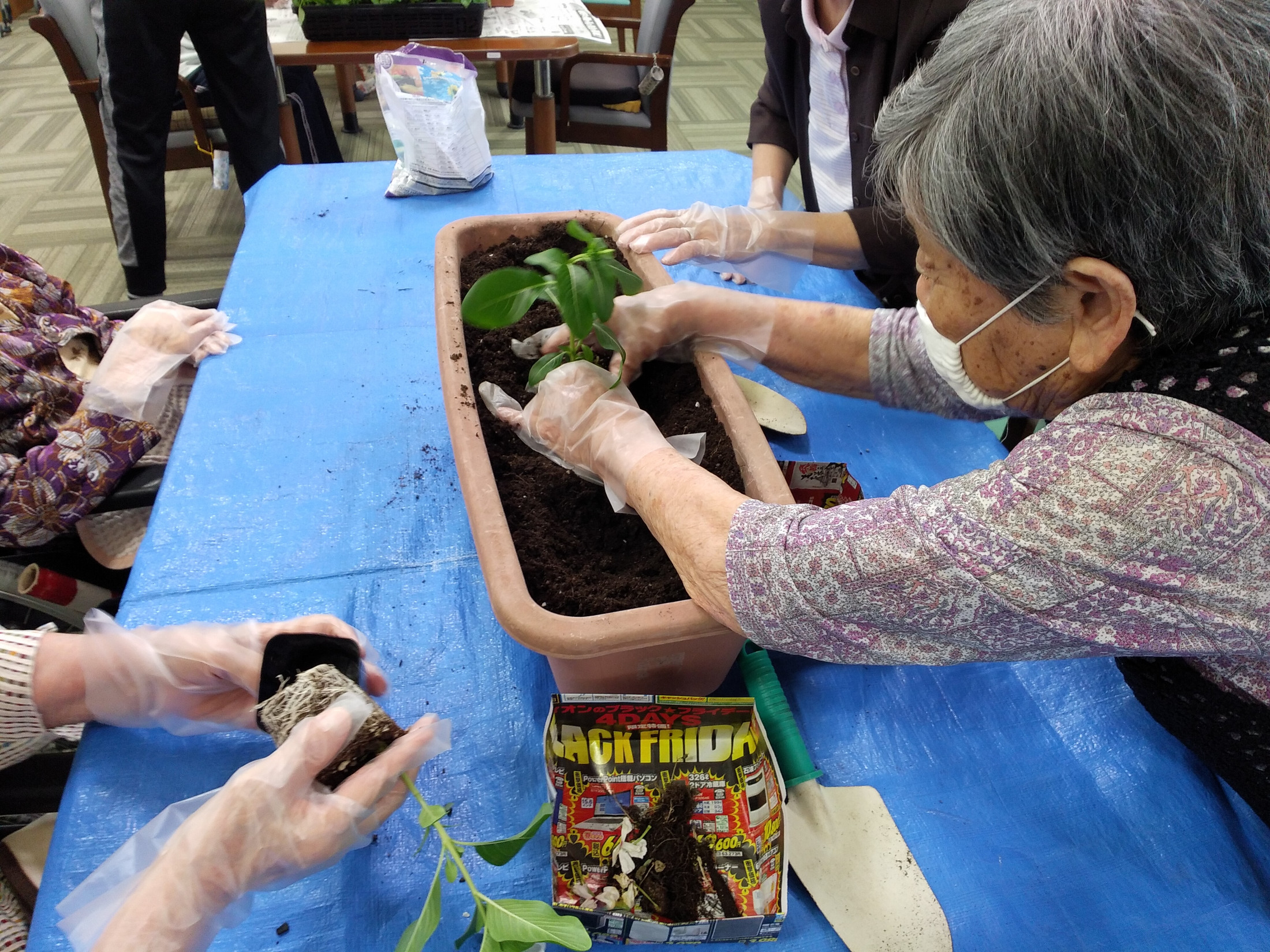 「プランターに土を入れ、お花を入れて・・」皆さんの真剣な表情です。